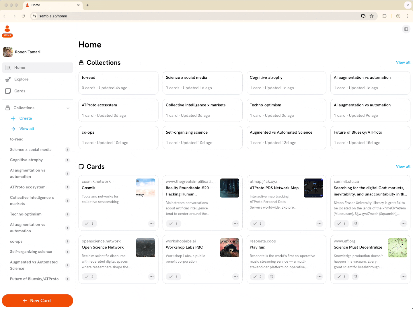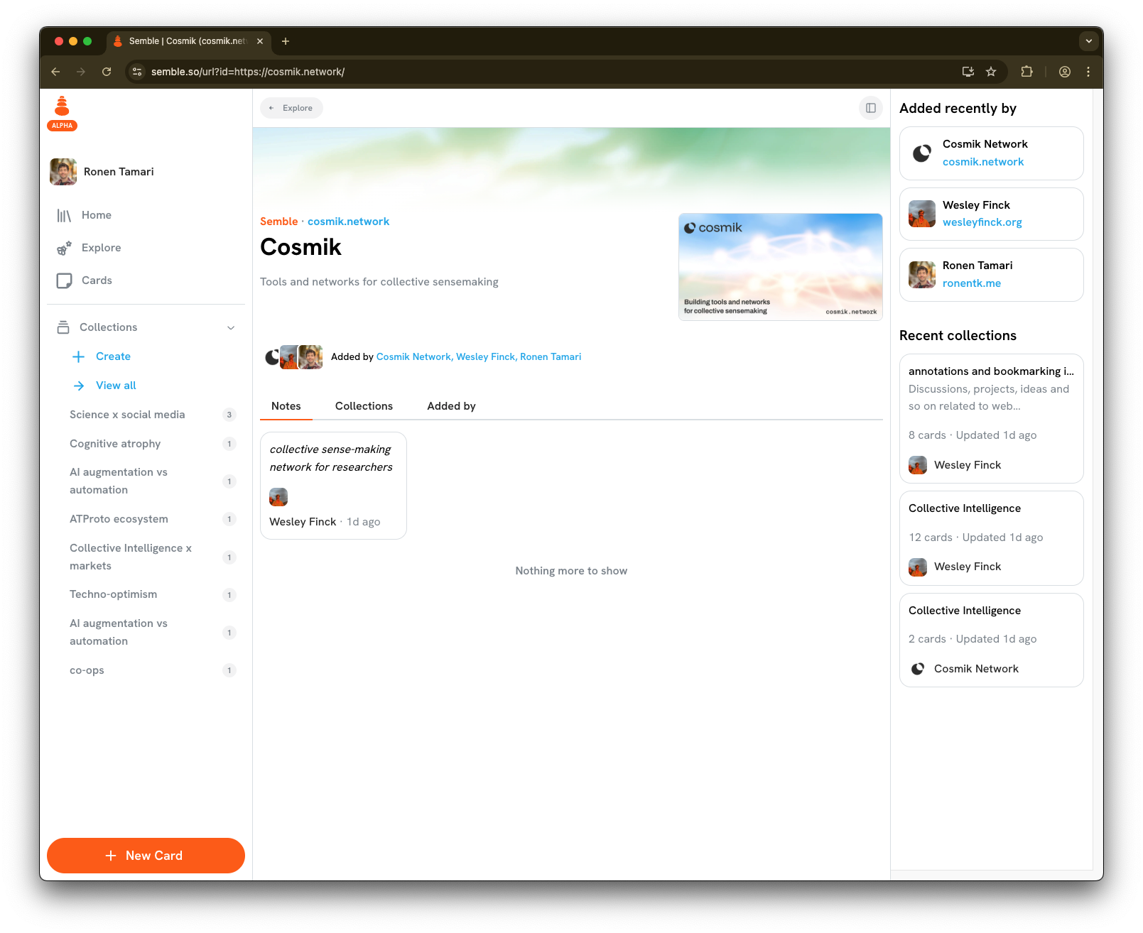 Clicking on a card will take you to the Semble page: a page aggregating all of the activity around the link in that card, such as collections it's featured in, and comments about the link. So each link shared on the network will have a corresponding Semble page, which you can also find at https://semble.so/url?id=/<link-url>[1]. So for example, https://semble.so/url?id=https://cosmik.network will aggregate the activity around https://cosmik.network/. In the future we plan for the Semble page to aggregate activity from other ATProto apps and beyond.