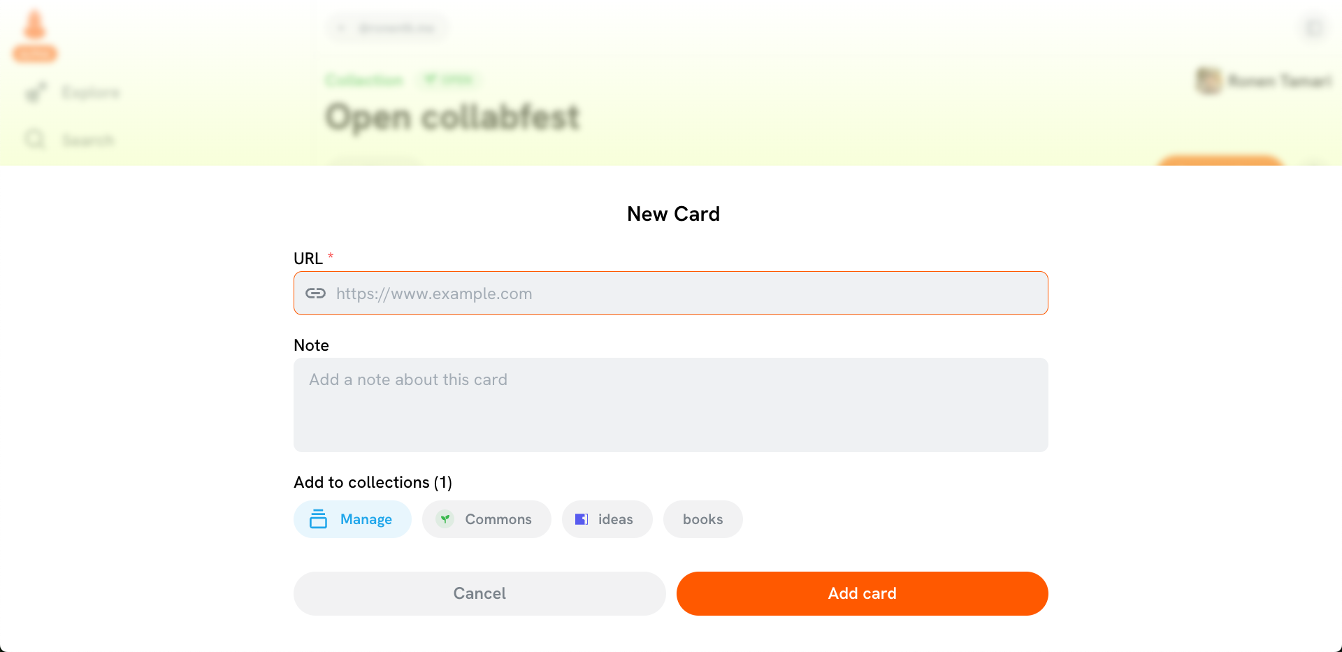 You can also add a card to the collection directly from the collection page by clicking the "Add Card" button in the top right. You'll see a drawer like this open with the open collection pre-selected: