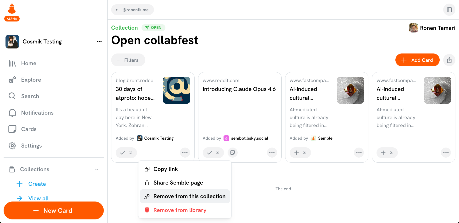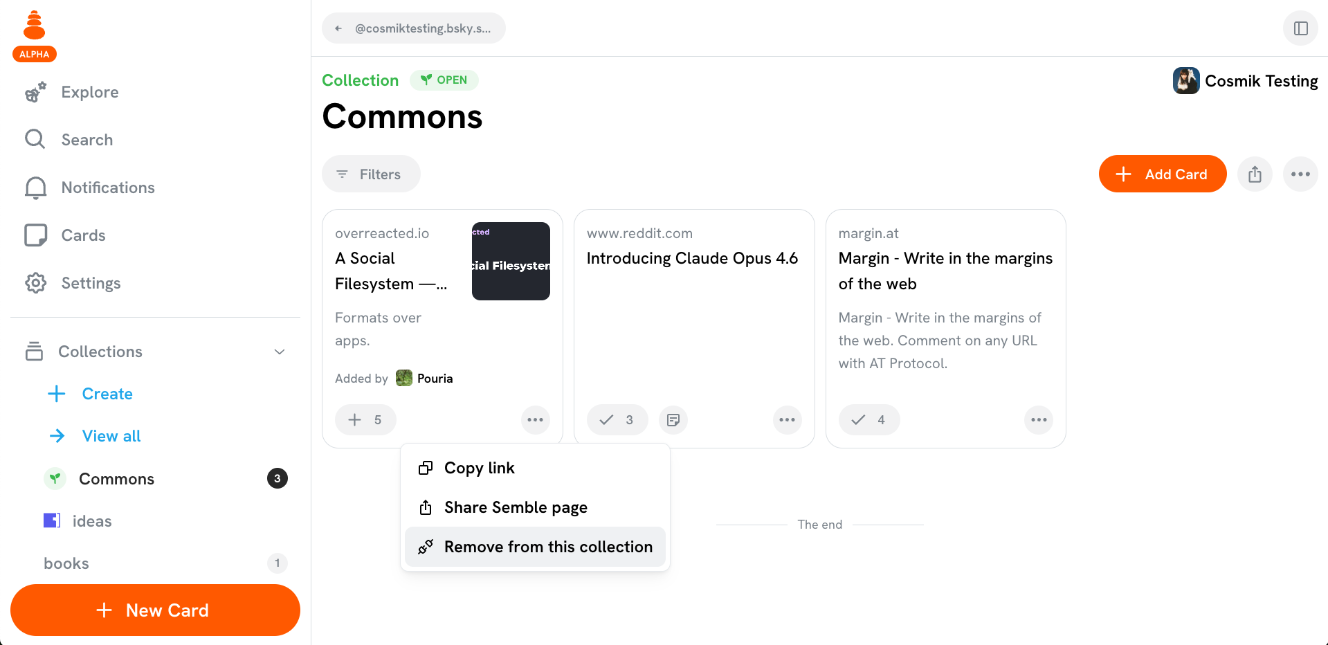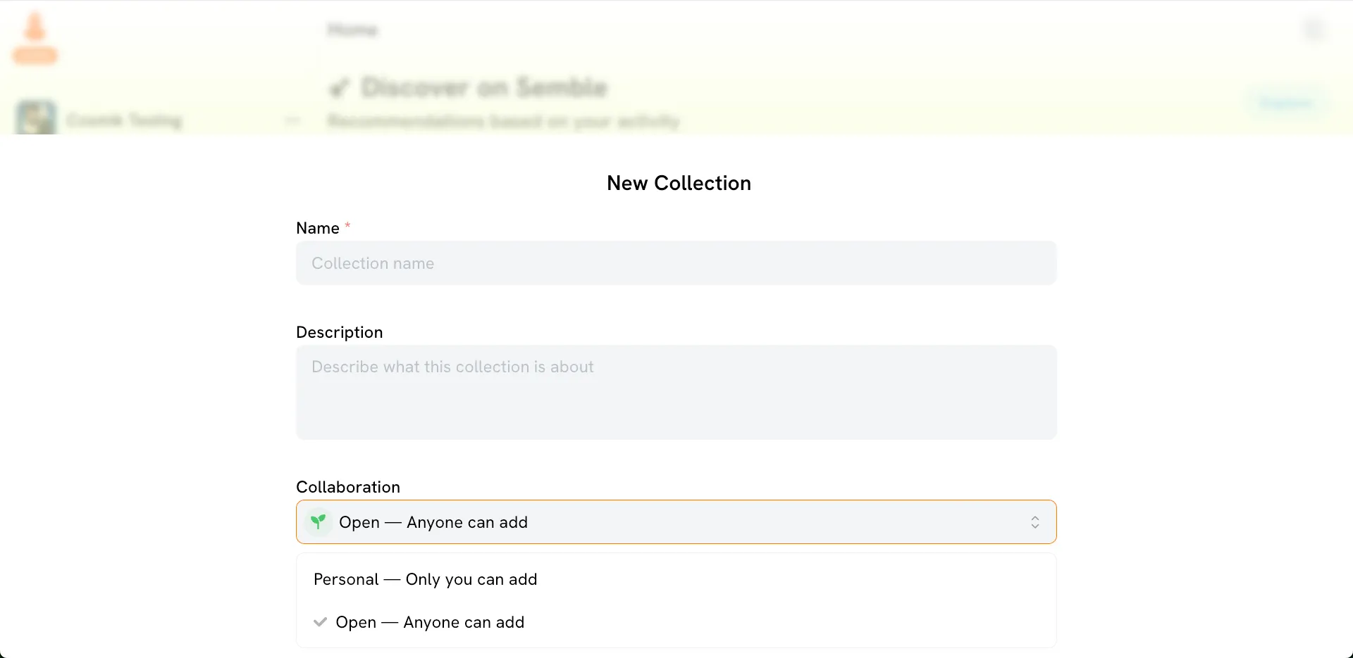 As we said above, this is a first step towards collaboration in the Atmosphere. There are two more forms of collaboration we want to roll out into Semble in the future: (1) scoped collaboration on personal collections, and; (2) teams/communities using group accounts.