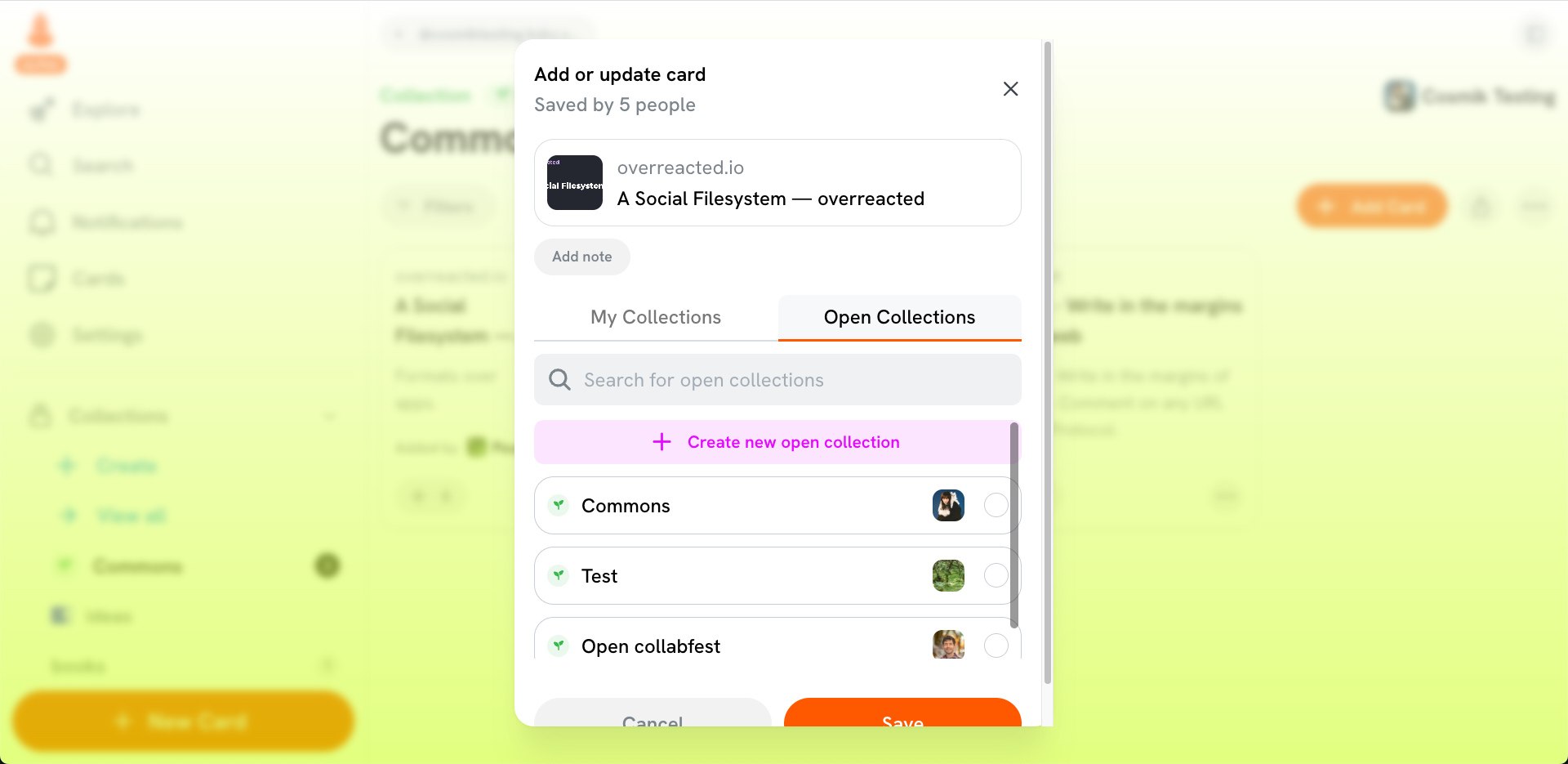 To add a card to an open collection, you can access a list of open collections in the same popup that you use to save cards to your own collections. Now there are two tabs: "My Collections" and "Open Collections: