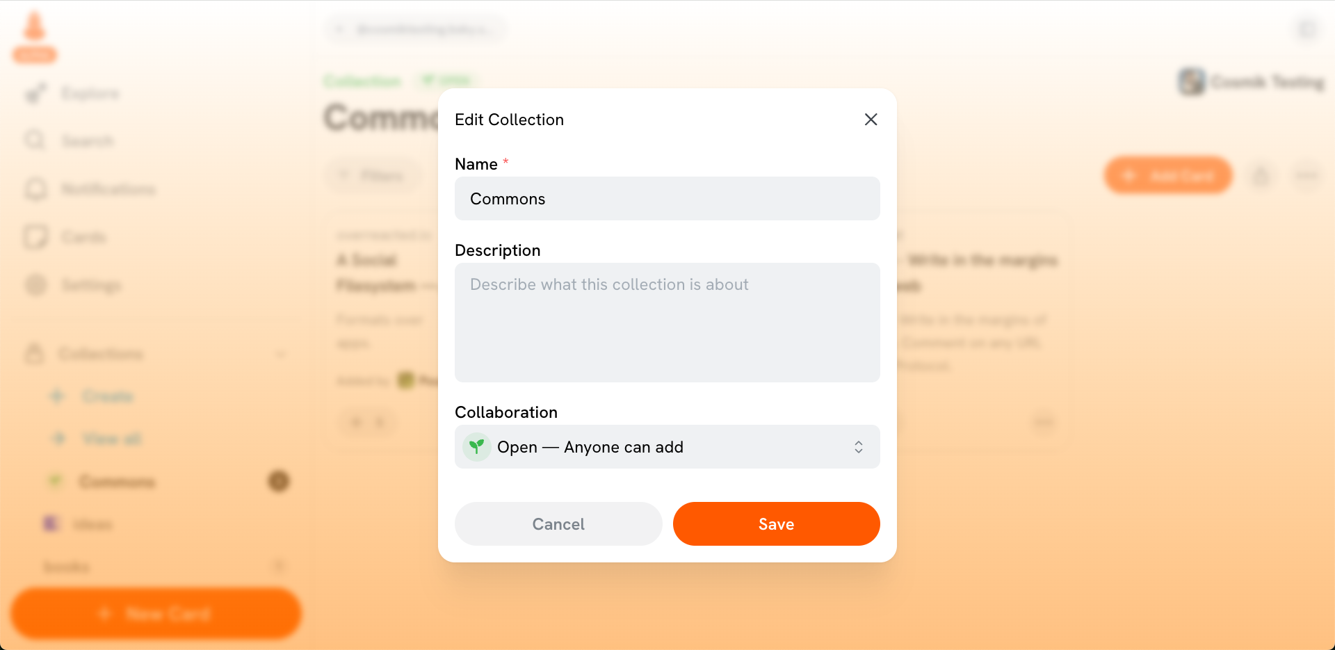 Whether you are creating a new collection or modifying an existing one, you now have the option to set the Collaboration type: Personal (only you can add cards) or Open (anyone can add cards). Here's what that looks like:
